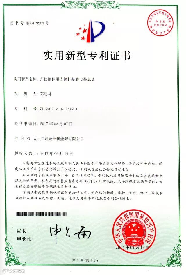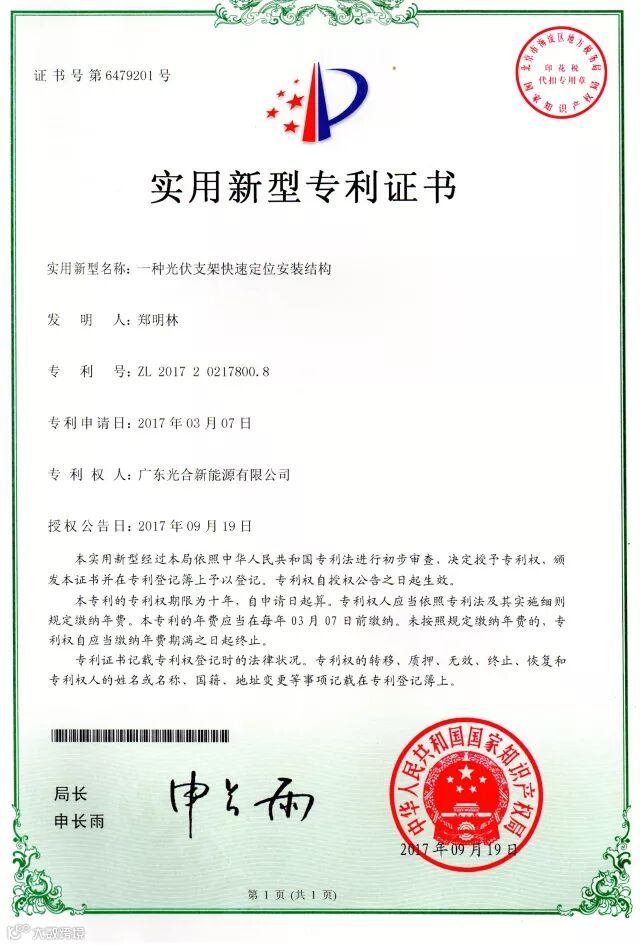 除了以上殊荣,光合能源在光伏组件支撑架构上也获得了很大的进步。经过多年的研发摸索,光合能源研制出自带防水槽的稳固支架,并申请专利。