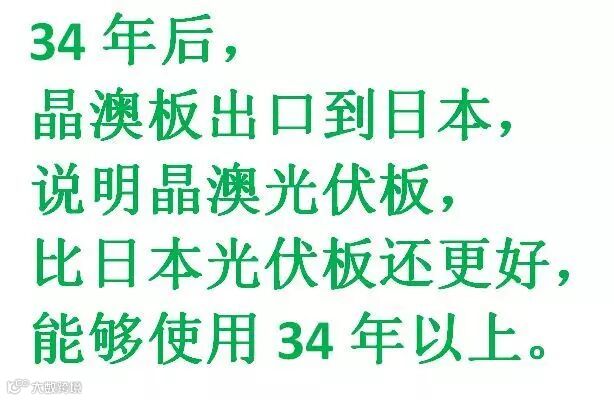 中国进口日本的光伏板已用三十四年,现在日本反过来进口晶澳板,说明晶澳板比日本板还好,能用三十四年以上。光合能源作为屋顶光伏电站领跑者,均采用晶澳光伏组件,坚持以“质量为本”的原则,保障用户的长期发电收益。