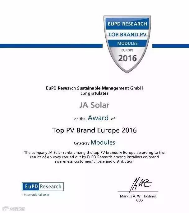 《晶澳太阳能荣获2016欧洲顶级品牌企业奖》