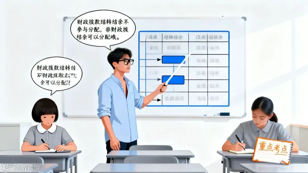 不参与结余分配;结转:财政拨款收入→财政拨款结转,财政拨款支出→财政拨款结转;符合条件转财政拨款结余