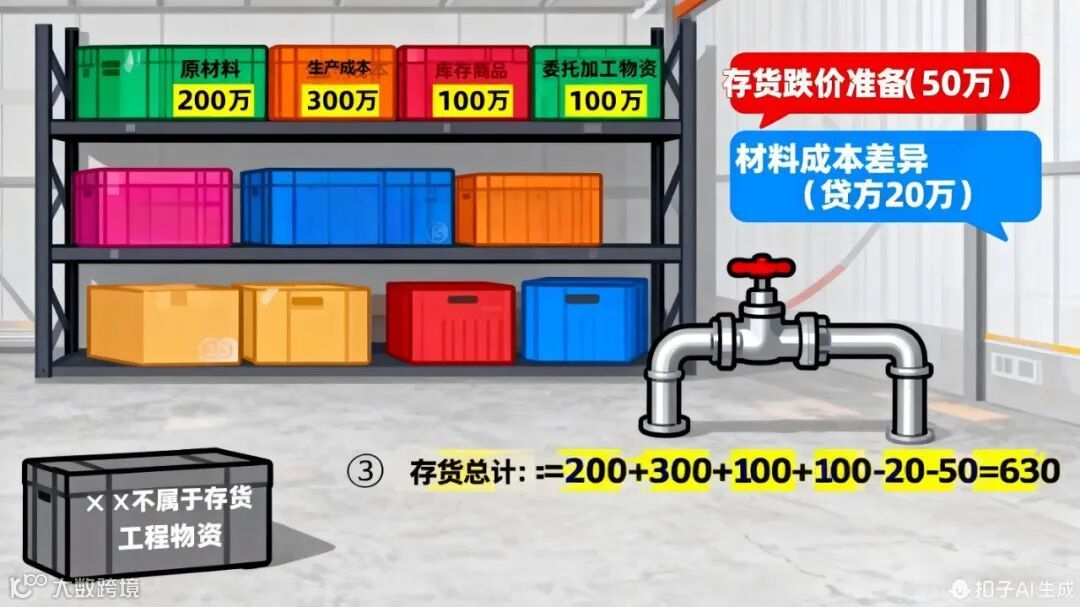 存货 = 原材料 + 库存商品 + 委托加工物资 + 周转材料 + 生产成本 + 发出商品等 - 存货跌价准备 ± 材料成本差异 - 受托代销商品款。