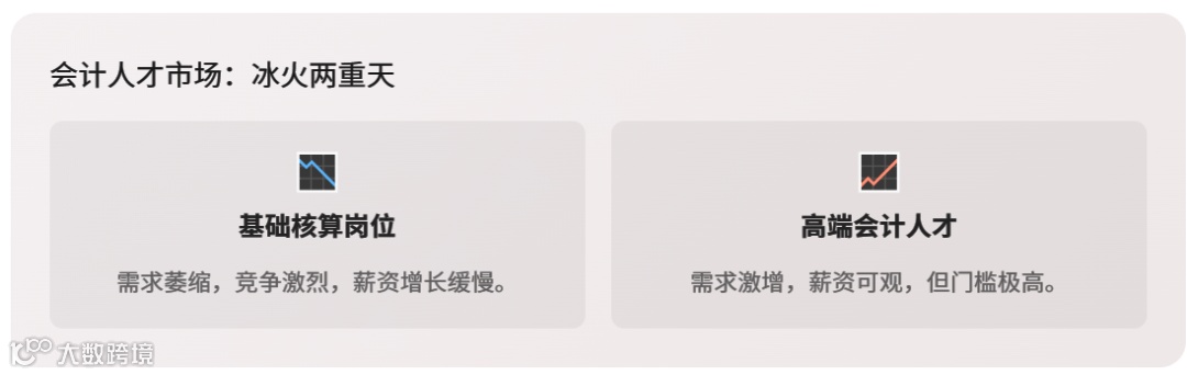 会计行业内部呈现出明显的“马太效应”。一方面,基础核算岗位严重饱和,竞争异常激烈;另一方面,高端会计人才(如具备管理会计、税务筹划、数据分析能力的人才)却严重短缺。 这种“弱技能学科”的属性,使得从业者难以像其他专业那样获得高成就感或高收入,导致职业发展后劲不足。