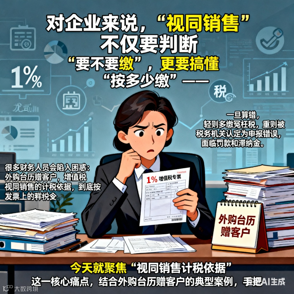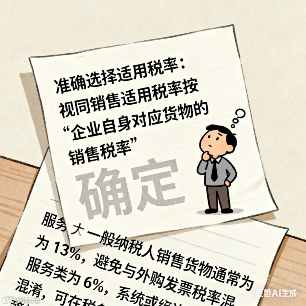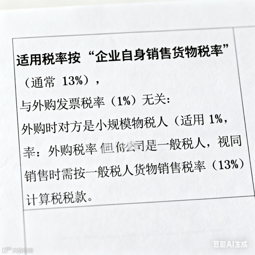 适用税率按 “企业自身销售货物税率”(通常 13%),与外购发票税率(1%)无关:外购时对方是小规模纳税人(适用 1% 税率),但你公司是一般纳税人,视同销售时需按一般纳税人货物销售税率(13%)计算税款。