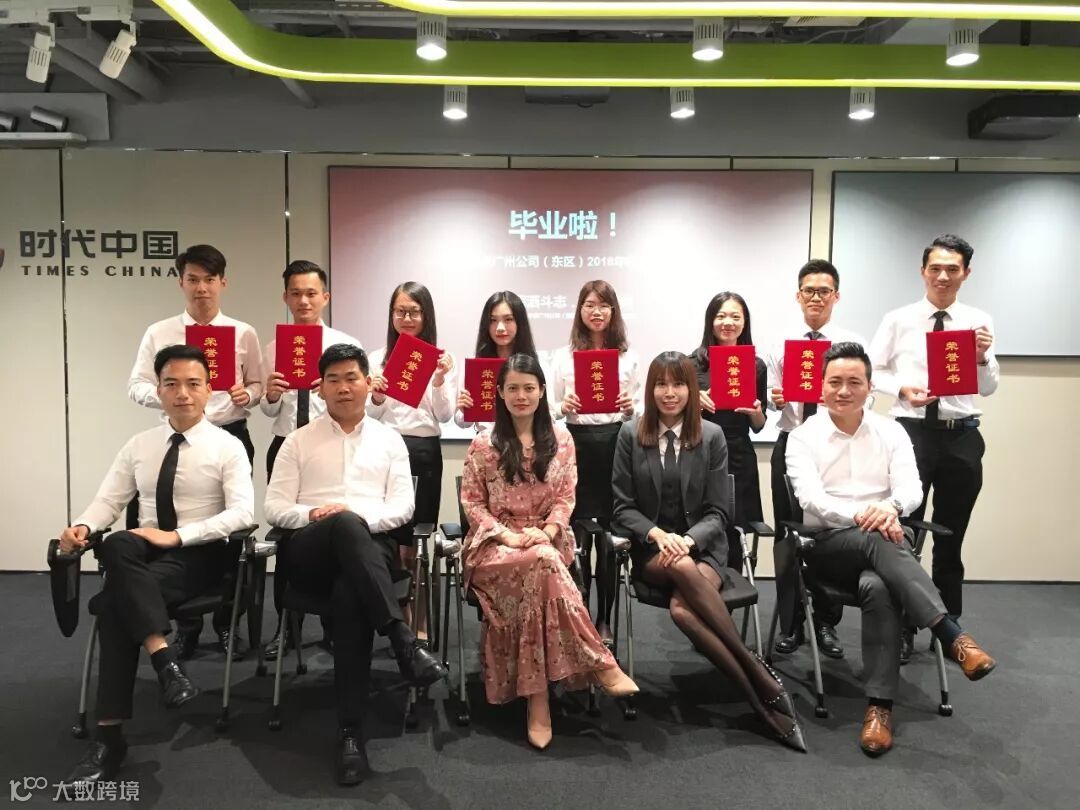 在一片欢声笑语和鼓励中,营销人力资源部负责人张玲玲、时代廊桥(增城)销售部销售负责人梁若祁为各位颁发了毕业证书,并邀请到场嘉宾时代天韵(广州)销售部销售政委冯举标与罗柯、时代天韵(广州)销售部销售组长张宇桐和新精锐们一同合影留念。