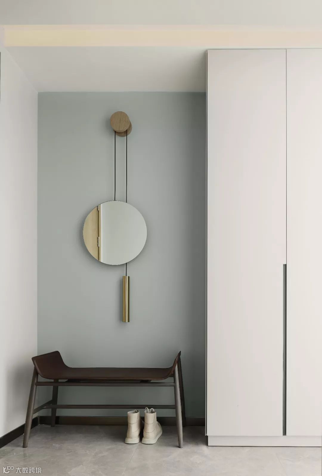 玄关处定制设计了短椅和可根据身高而上下调整的镜子,打造了一个实用现代美学生活场景,兼顾形式美感与实际需要。