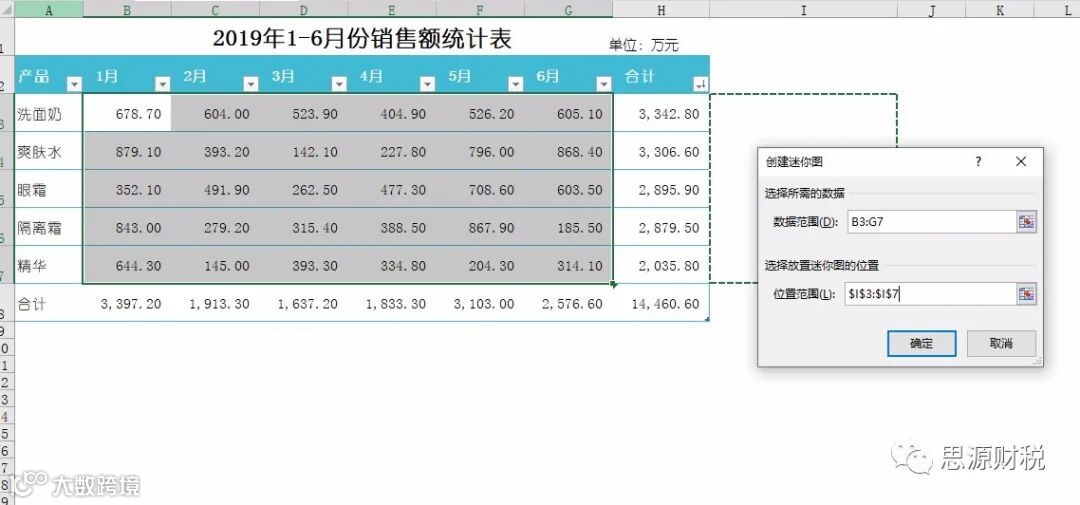 第二步:打开创建迷你图的对话框,在对话框中输入需要数据及放置的位置,如图1-2;