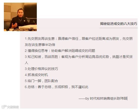 最后,玮姐跟我们分享了关于销售技巧的六点干货:先交朋友再谈生意;换位思考;知己知彼;如何处理价格异议的情况;抓准成交时机;临门一脚,团队配合。这些技巧真的给了我们几个销售“小白”很多的启发,使我们能更快地熟悉销售这门学问。希望以后能有更多机会听到各位前辈的培训演讲!