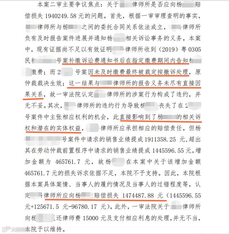 近日,一宗当事人向律所百万索赔案引爆全网。杨女士以某律所代理律师未能及时提醒其补缴诉讼费,导致案件被法院裁定撤诉为由,要求该律所全额赔付其起诉金额的194万。案件经一、二审法院审理后,判决该律所需要赔偿当事人原来案件起诉金额的绝大部分——147万。