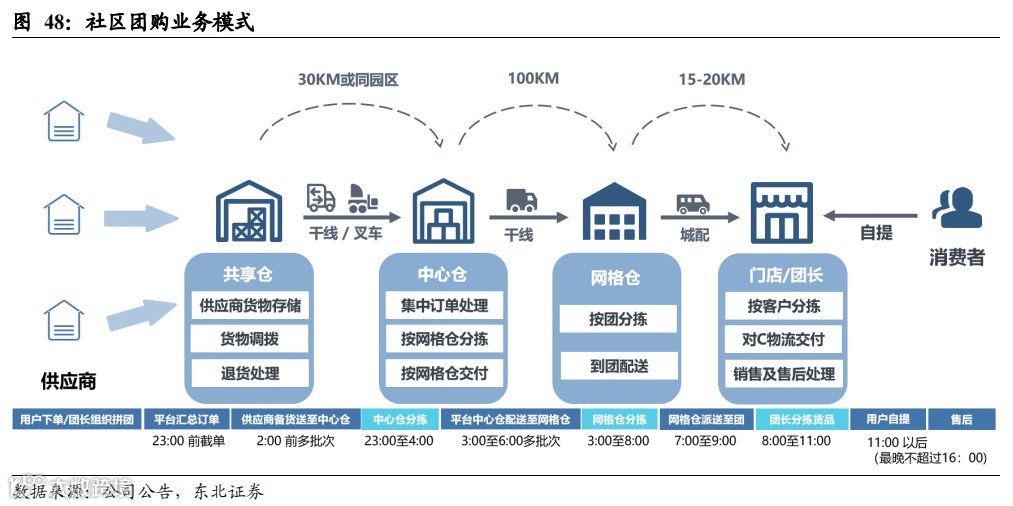 社区团购主要通过供应商-三级仓配(即共享仓-中心仓-网格仓)-团长-消费者的履约链条建立起“预售+自提+次日达”模式:1)社区团购平台于每晚 23 点前截单,将需求汇总后分发至各供应商,供应商于次日 2 点前将货物提前存储在靠近中心仓的共享仓;2)共享仓通过干线/叉车分批将商品送至中心仓;3)中心仓集中订单处理,将货物按网格仓进行分拣并于 3 点至 6 点期间多批次将货物运送至对于网格仓;4)网格仓收到商品后按其覆盖的团点进行分拣并于 9 点前配送至团长处;5)团长收到货物,按客户进行分拣、理货后通知群内客户上门取货,同时承担售后处理工作;6)11 点后客户收到取货通知后自行前往团长处提货完成履约交付。
