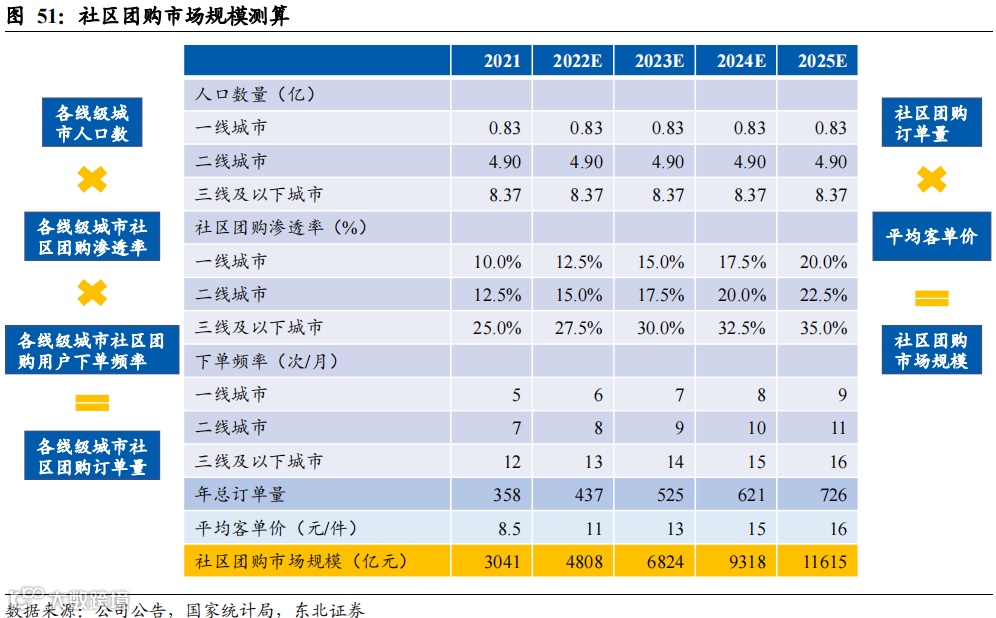 从市场空间来看,预计 2025 年社区团购市场规模可达 1.16 万亿。我们根据公式“社区团购市场规模=不同线级城市人口*对应市场社区团购渗透率*月下单频率*12*客单价”对当前社区团购规模及未来市场空间进行测算。根据国家统计局数据,一线/二线/三线及以下人口分别为 0.83/4.90/8.37 亿,对应 2021 年渗透率预计分别为10%/12.5%/25.0%,下单频率分别为每月 5/7/12 单,因此年总订单量可达 358 亿单,平均客单价为 8.5 元/单,可得 2021 年社区团购市场规模 3041 亿元;预计至 2025 年一线/二线/三线及以下城市社区团购渗透率分别达 20.0%/22.5%/35.0%,下单频率分别增至每月 9/11/16 单,因此年总订单量达 726 亿单,假设平均客单价提升至 16 元/单,可得 2025 年社区团购市场规模为 1.16 万亿。