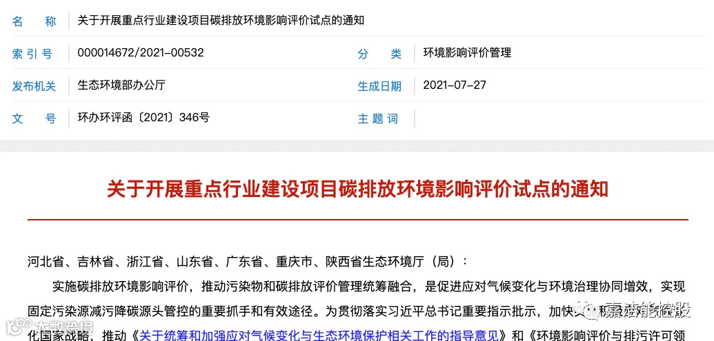 对于建设项目双碳影响分析,这并不是头一回 。早在2021年,生态环境厅就发布了重点行业建设项目碳排放环境影响评价试点(简称“碳评”)及碳评具体的技术指南(以下简称“指南”)。