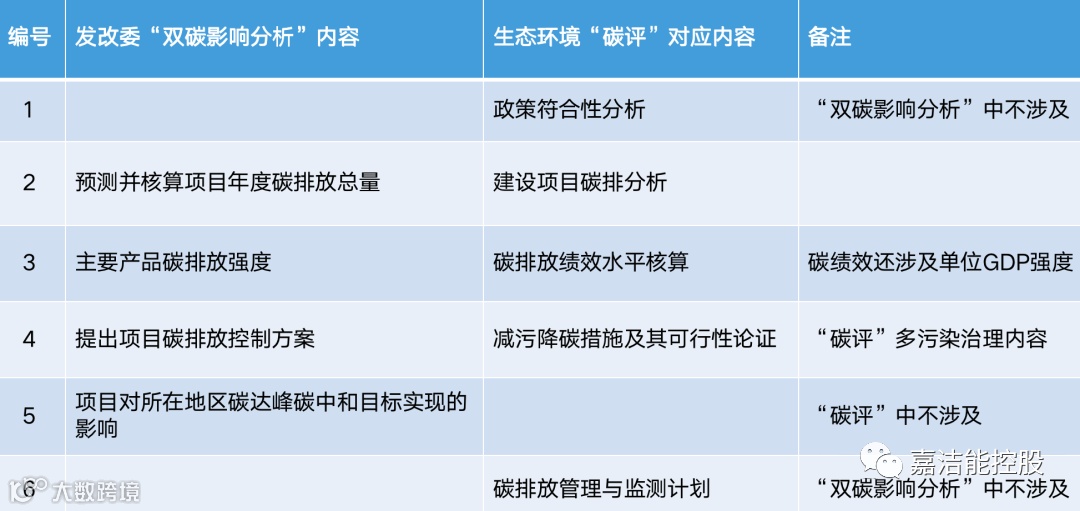 再看一下发改委可研中新增的“双碳影响分析”与生态环境部的“碳评”有什么异同。目前“双碳影响分析”还未发布具体的编写指南,我们只能从可研编写提纲内容来做对比。