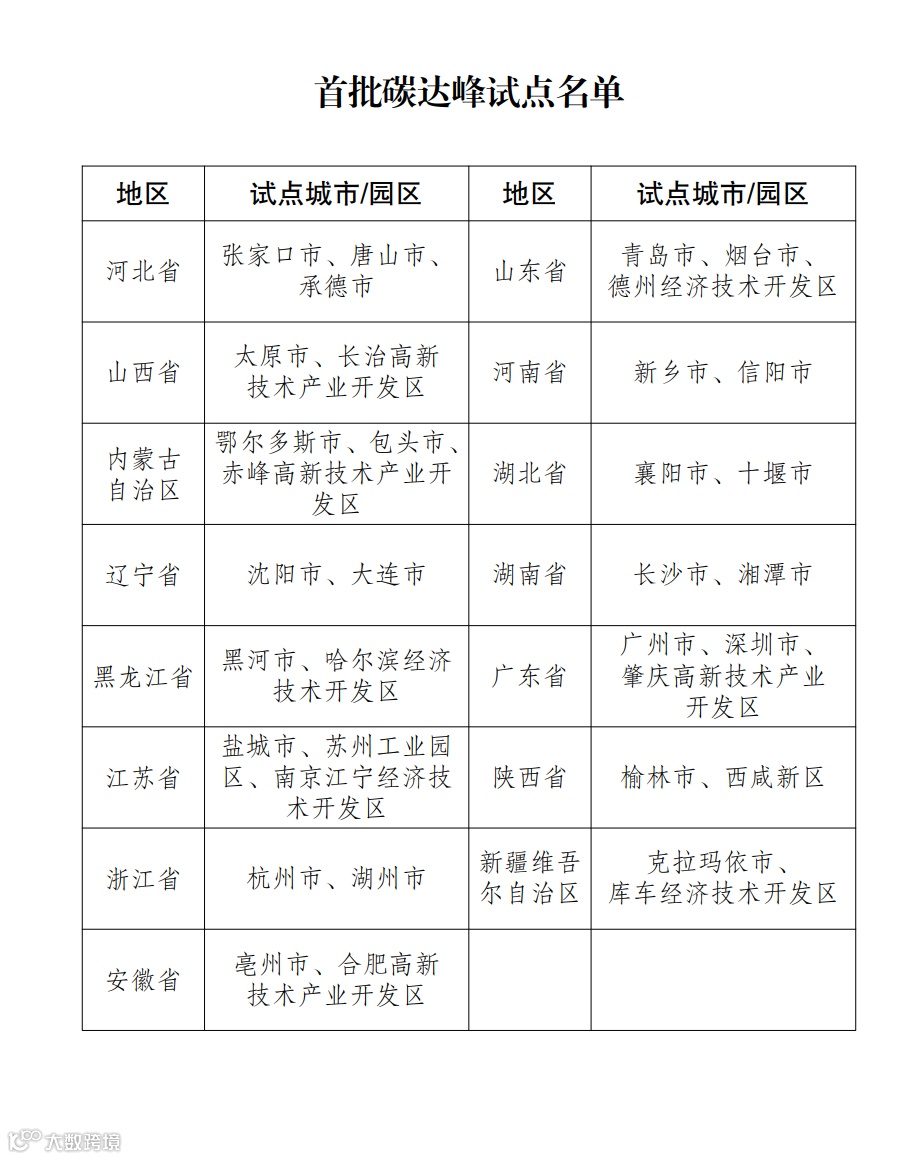 12月6日,国家发展改革委办公厅发布的《关于印发首批碳达峰试点名单的通知》显示,为落实国务院《2030年前碳达峰行动方案》有关部署,按照《国家碳达峰试点建设方案》工作安排,确定张家口市等25个城市、长治高新技术产业开发区等10个园区为首批碳达峰试点城市和园区。