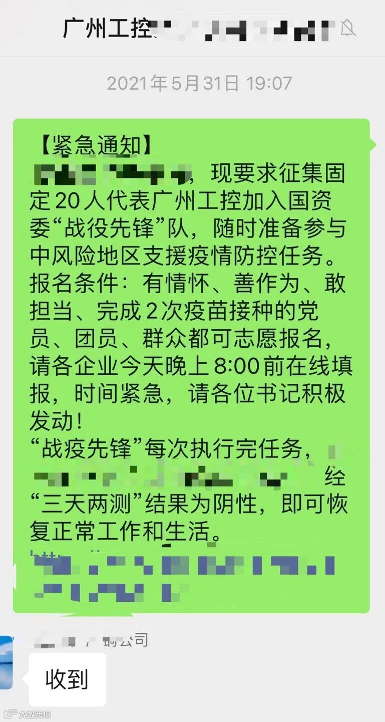 当前正值广州市疫情防控关键阶段,5月31日晚7时许,广州工控接到市国资委紧急通知,急需完成2针疫苗接种的党员、团员、群众组成“战疫先锋”队伍,承担前往中风险地区的支援任务。消息一经在广州工控支援疫情突击队微信群中发布,即得到刷屏式响应,不到3个小时,20名广州工控“战疫先锋”勇士完成集结!