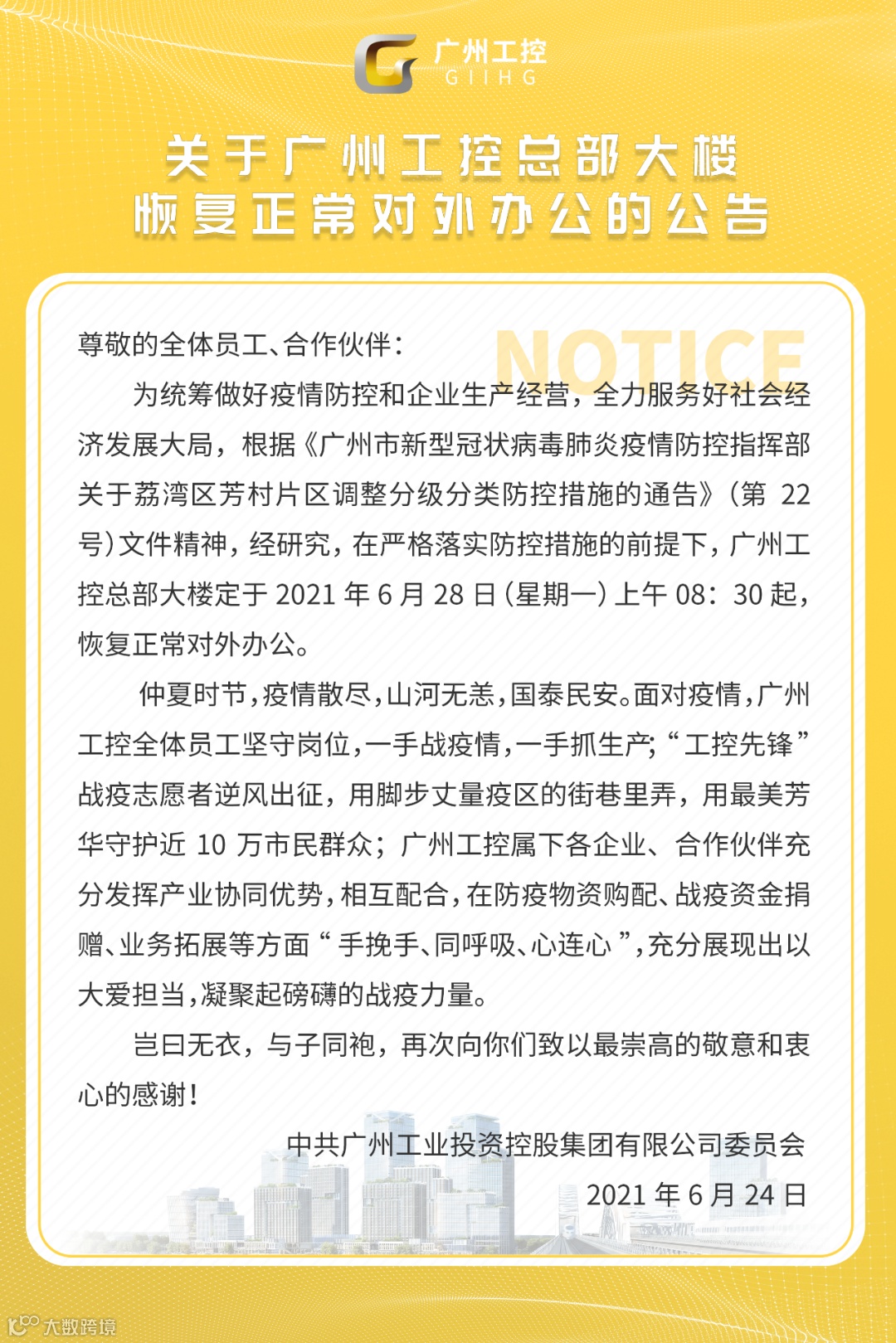 关于广州工控总部大楼恢复正常对外办公的公告