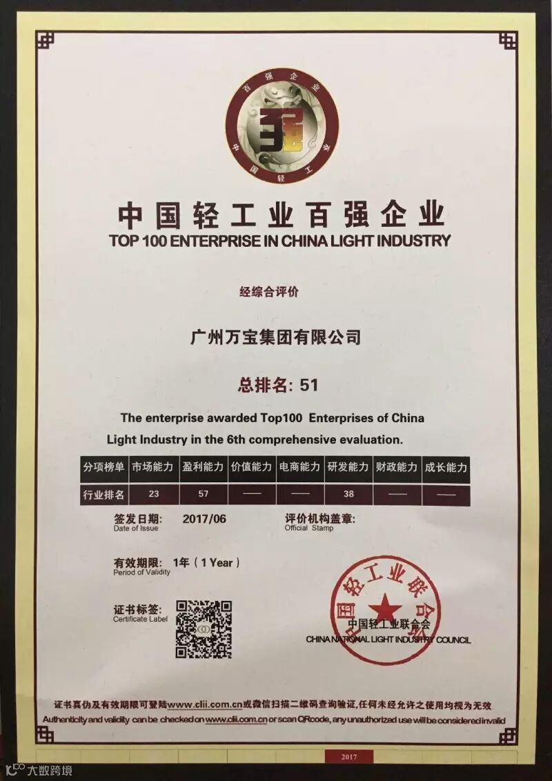 2017年6月20日,中国轻工业联合会在北京举办了“‘智慧轻工’高峰论坛暨中国轻工业百强企业颁奖盛典”。广州万宝集团有限公司凭借着卓越的品牌力量和超强的市场能力、盈利能力以及研发能力获得“2016 年度中国轻工业百强企业”称号,总排名第51名。