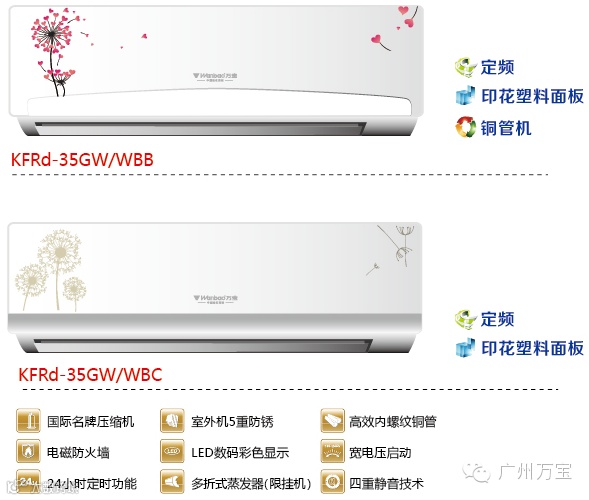 广州万宝商用空调器有限公司依托万宝集团自身二十年的资源优势,以及集团与日本、美国等国外先进制冷企业强强合作的优势,研制了八大系列七百多个规格的中央空调产品。产品系列包括:超级变频多联机组、变容量多联机组 、风冷式冷热水机组、风管机组、水源热泵、水冷柜机、嵌入式天花机、风机盘管。