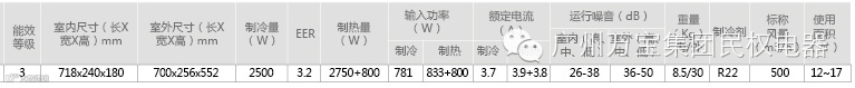 定频普通能效,印花塑料面板,中间透字显示,内机710(Φ7×2)箱体,外机700(Φ7×1)箱体,3米铜管。