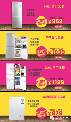 团购活动内容:活动期间参加团购并满足要求的朋友们,特定机型可享有以下优惠价位:万宝小冰箱BC-52D 惊爆团购价399元(原价:599元),万宝冷柜BC/BD-100E 惊爆团购价 699元(原价:849元)
