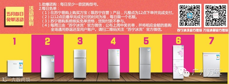 免单活动:活动期间每天中午12点(整点)起,首位登录苏宁易购网下单并完成支付购买指定万宝冰箱或万宝冷柜(限苏宁自营)的朋友享有免单资格。(注:下单并完成支付的时间以活动期间每日12点起,首位完成支付的时间为准。免单名额每日仅限一位,货到付款不可参与本活动。)