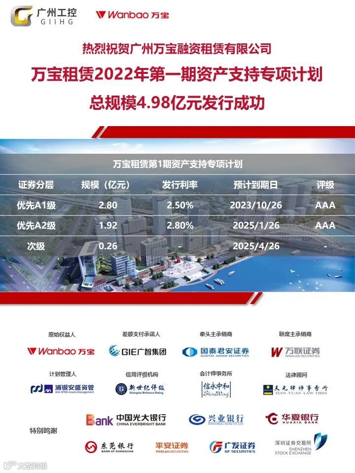 9月22日,广州万宝融资租赁有限公司15亿元储架ABS的首期项目正式设立,发行规模为4.98亿元。在各位合作伙伴的全力支持下,最终发行利率为优先A1级2.50%,优先A2级2.80%,创下了我司参与资本市场融资以来的新低。