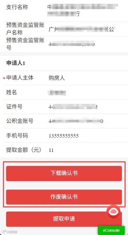 2、进入详情页面后,可查看确认书的详细信息以及每个申请人的提取金额。可点击“作废确认书”或“下载确认书”进行相关操作。
