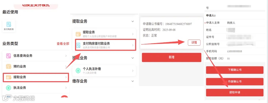 1、任一申请人登录个人住房公积金账户,依次点选:提取业务-支付购房首付款业务-详情