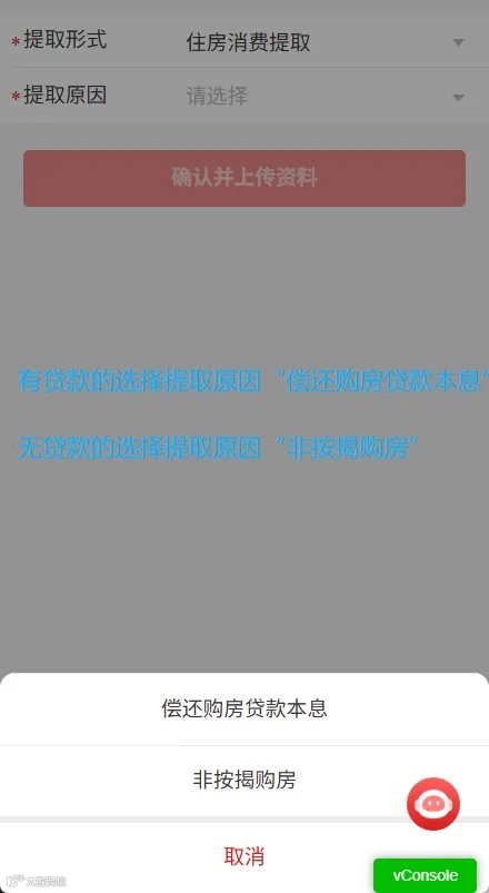 ★有贷款的选择提取原因“偿还购房贷款本息”;无贷款的选择提取原因“非按揭购房”