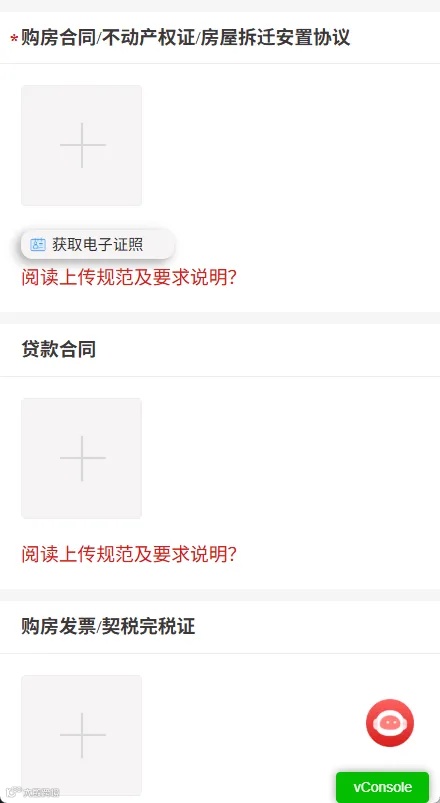 5、跳转至上传资料页面后,找到对应的项目点击“+”号,依次上传《商品房买卖合同》和身份证。