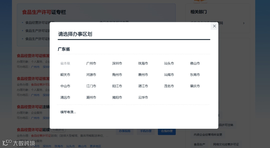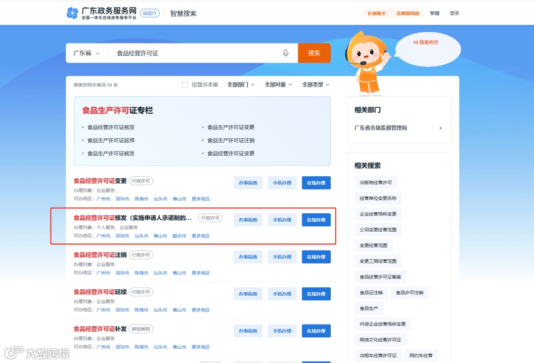 1、打开广东省政务服务网,搜索“食品经营许可证”,选择“食品经营许可证核发”,点击在线办理。