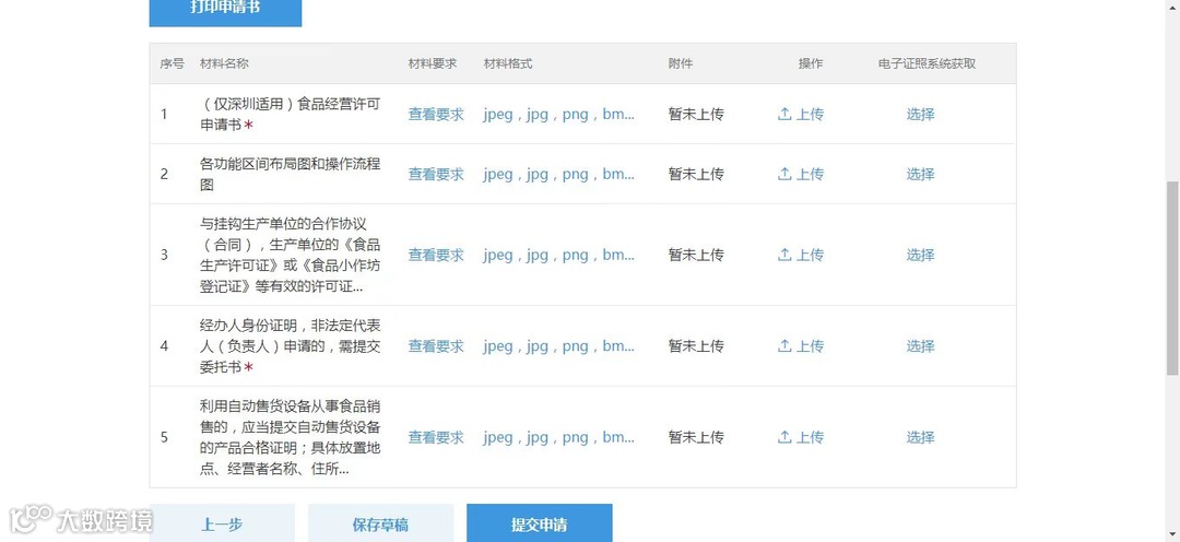5、填写完毕后,进入“资料上传”页面,点击“打印申请书”。