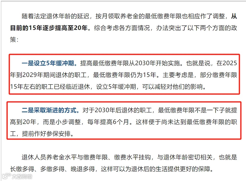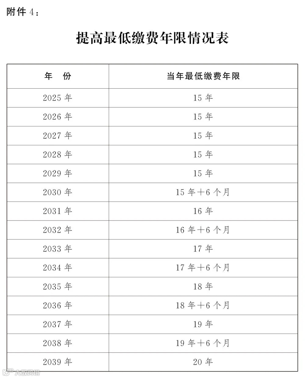 从2030年1月1日起,将职工按月领取基本养老金最低缴费年限由十五年逐步提高至二十年,每年提高六个月。职工达到法定退休年龄但不满最低缴费年限的,可以按照规定通过延长缴费或者一次性缴费的办法达到最低缴费年限,按月领取基本养老金。