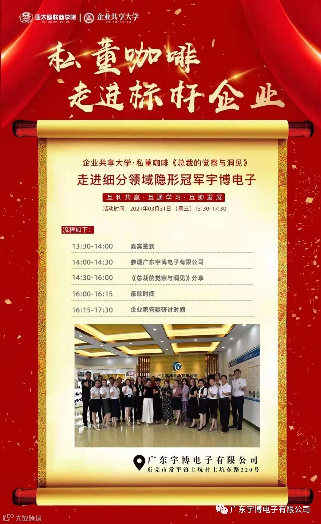 2021年3月31日下午,由亚太欧联商学院·企业共享大学主办的私董咖啡走进了宇博,共话企业发展之路。或者正如战略合作伙伴亚太欧联商学院所言,宇博有着特殊的魅力,故引致各行各业企业家纷纷前来一探究竟,整个会场座无虚席。