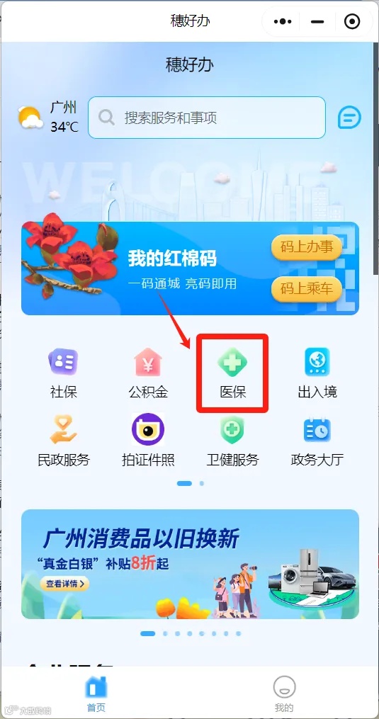 第一步:打开穗好办小程序,并在首页点击“医保”后点击“生育津贴支付”,或搜索“生育津贴”后点击“生育津贴支付”。