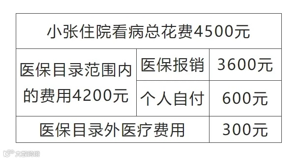 小张在医院住院看病,总花费4500元,其中纳入医保目录的医疗费用4200元,医保报销3600元,医保目录外医疗费用300元。