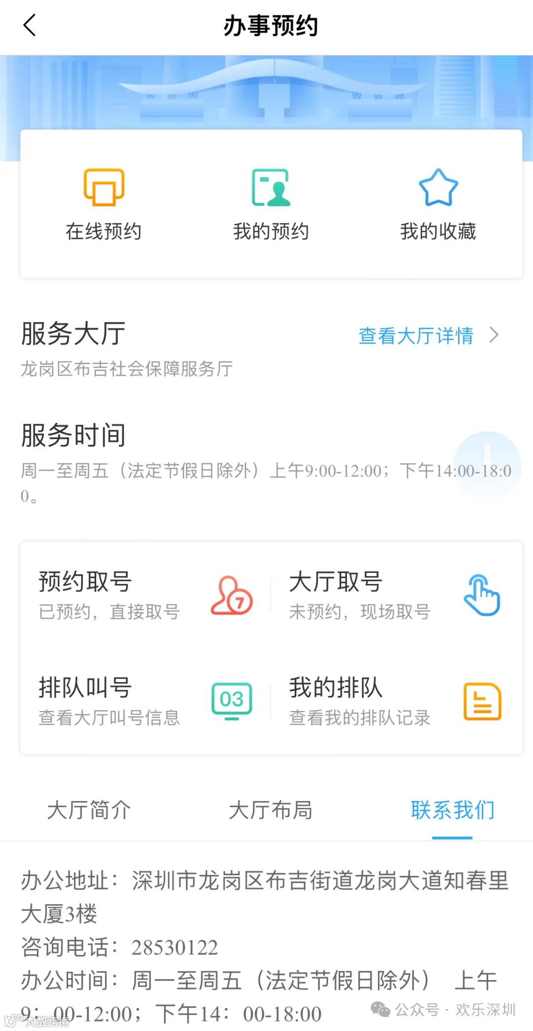 预约直接在i深圳APP上预约,比如去预约布吉社保局,上面有预约取号和地址和电话。总之,有事打这个电话就对了!