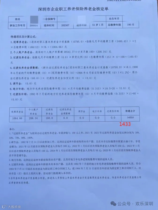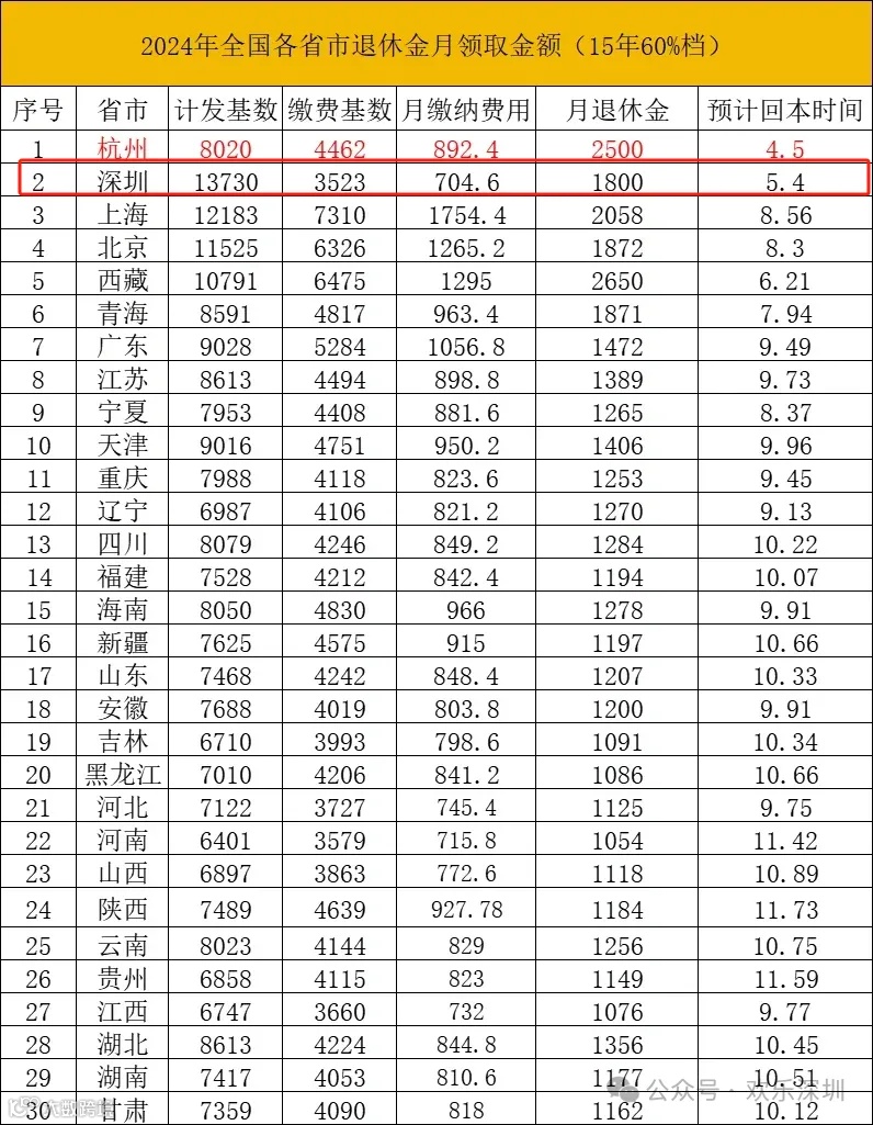 深圳的退休算法也颇有讲究,满15年可领1619元,20年可领2217元,30年则高达3704元。