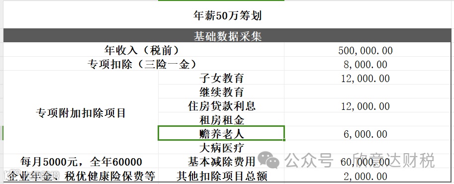 基础资料(具体见下图5):某公司A员工,年薪50W,专项扣除8K/年,子女教育1.2K/年,住房贷款利息1.2K/年,赡养老人6K /年,企业年金,健康保险费2K/年,基本减除费用6K/年。 Q:个人所得税如何筹划交税最少?