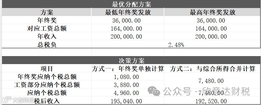 结论:方式一:年薪收入20W,可拆分为年终奖3.6W,工资16.4W,税负率为2.48%,税后收入多,交税少,为最优分配方案,具体见下图4所示。