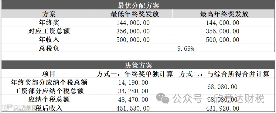 结论:方式一:年收入50W,可拆分为年终奖14.4W,工资35.6W,税负率为9.69%,税后收入多,交税少,为最优分配方案,具体见下图6所示。