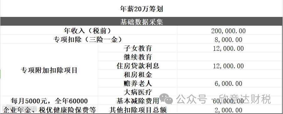 基础资料(具体见下图3):某公司A员工,年薪20W,专项扣除8K/年,子女教育1.2K/年,住房贷款利息1.2K/年,赡养老人6K /年,企业年金,健康保险费2K/年,基本减除费用6K/年 。Q:个人所得税如何筹划交税最少?