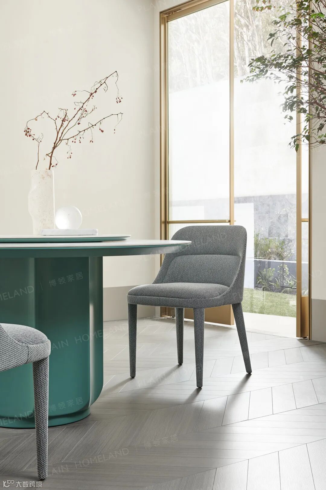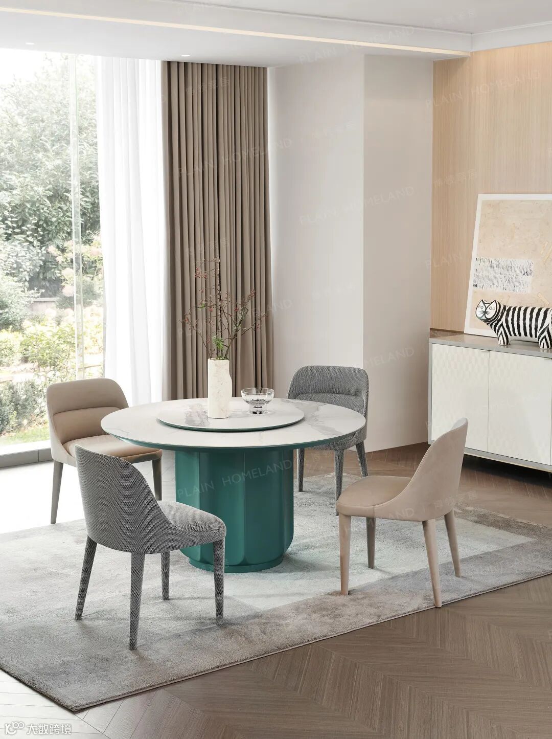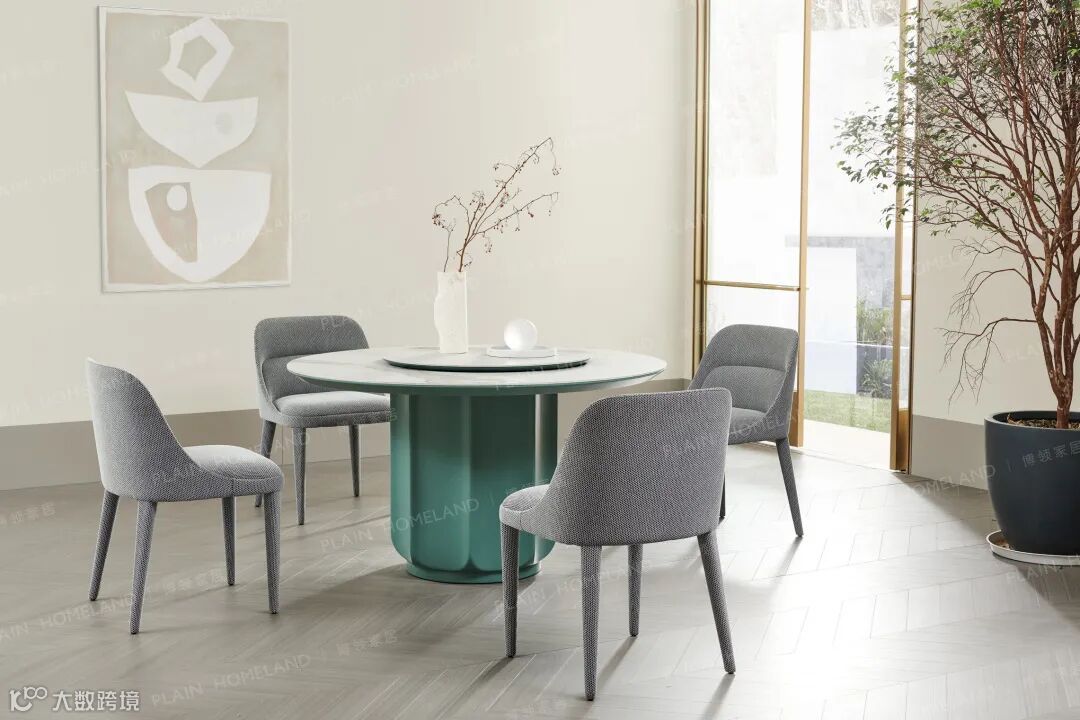 蒂芙尼蓝的配色打破沉闷,圆形桌面可容纳4-6人轻松落座,可搭配360°旋转转盘,亲友聚餐舒适尽兴;3色环绕、光影入室,最衬用餐时的放松心境。