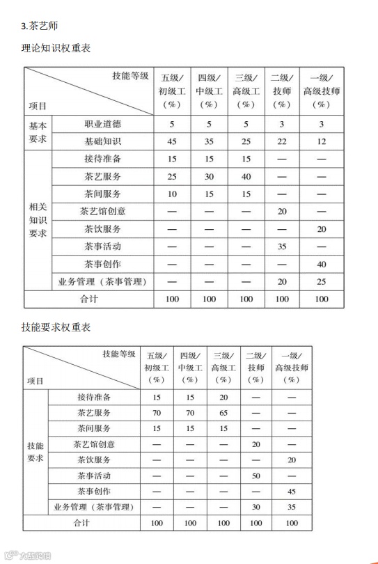 相关职业:在茶室、茶楼和其他品茶、休闲场所的服务工作,以及评茶、种茶、制茶、售茶岗位的工作,下同。