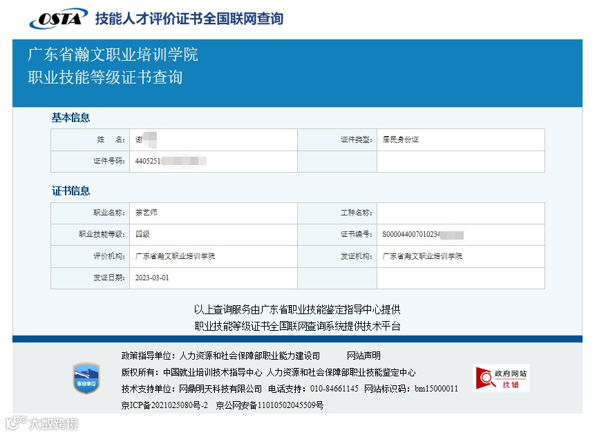 随着国家技能人才评价制度改革的推进,原来的职业技能鉴定转为职业技能等级认定。通过本次认定的人员,将由广东省瀚文职业培训学院颁发职业技能等级证书。该证书可在人社部全国职业技能等级证书联网查询系统查询(网址为:http://zscx.osta.org.cn/)
