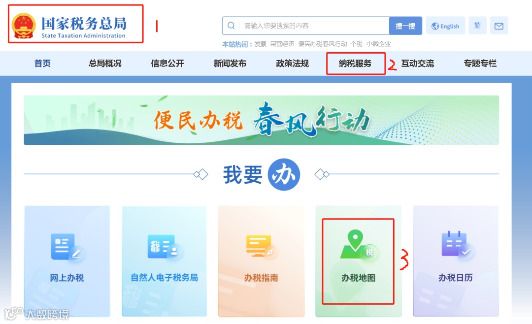 【国家税务总局】-【纳税服务】-【办税地图】,再选择地区即可。