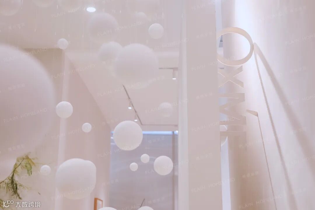 在展馆入口处通过上下大小各异,聚散并无规律的悬吊球设计,去表达OXME傲觅从无到有、再到成为一个极具探索与创新精神的品牌,在品牌进化历程中不断思考与创造的过程,同时正是基于这样的设计理念将OXME傲觅始终宣导的“探索、发现”这一品牌精神展示出来。
