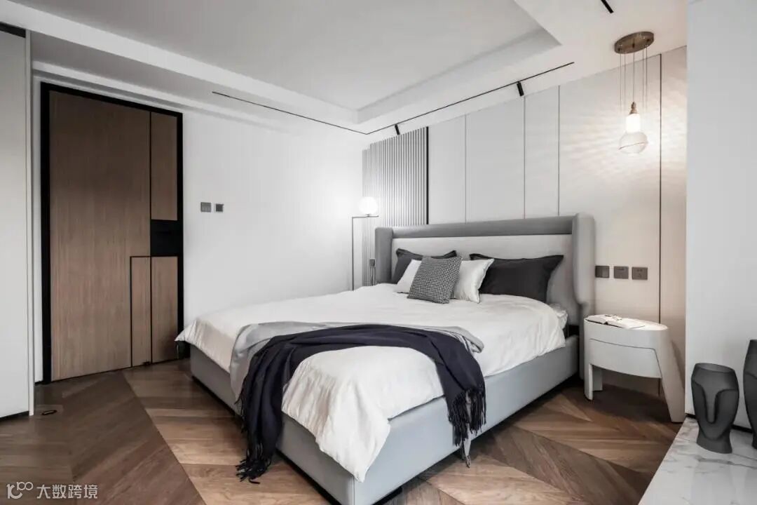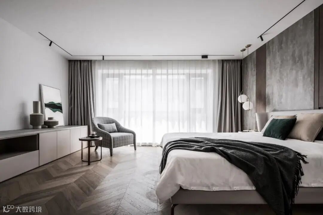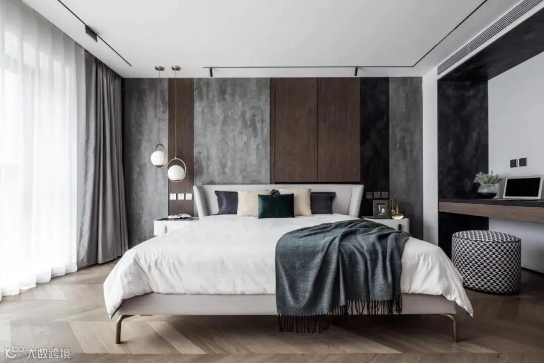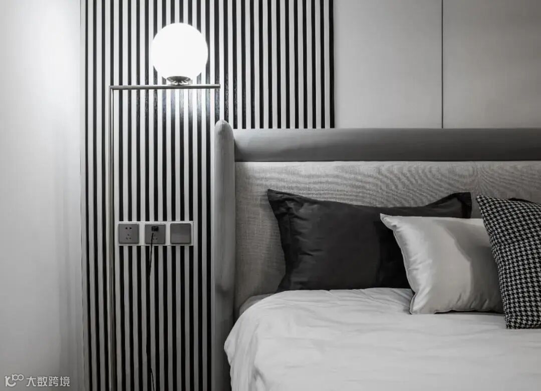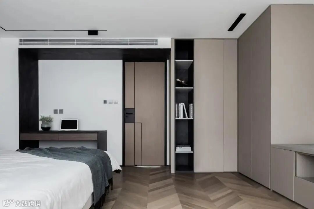移步客卧,在看似简洁质朴的外表下隐藏着低调的高级感,深浅不一的米灰色提升细腻的空间体验,营造出舒适惬意的睡眠环境;床头深色条纹背景板增强空间设计感。
