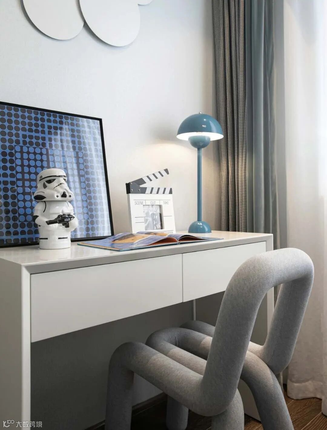 儿童房色彩相对来说丰富一些,但也利落干净,床头背景墙没有过多的装饰,以清晰地线条和几何图形,打造舒适宁静的居住环境,设计感十足的书椅,使孩子们于空间中享受生活的慢步调。