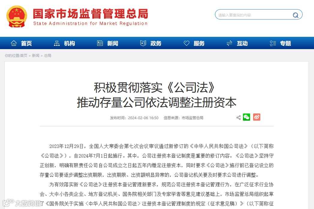 2024年2月6日,市场监管总局网站刊发“关于公开征求《国务院关于实施〈中华人民共和国公司法〉注册资本登记管理制度的规定(征求意见稿)》意见的公告”。该征求意见稿的主要内容包括: