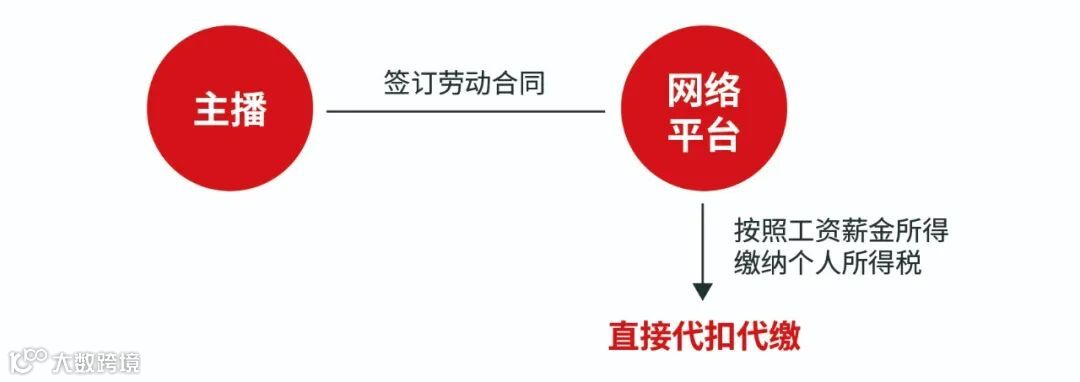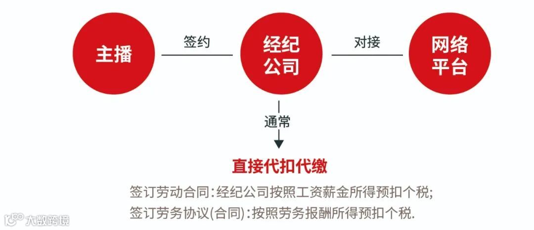 主播个人与经纪公司(比如各种MCN机构)签约,由经纪公司对接网络平台,同时经纪公司负责主播的宣传、公关、签约、谈判等服务,然后从主播的收入中抽取一部分服务费。对于这种情形呢,网络主播个人所得税的扣缴义务人,通常认为是经纪公司,这里值得注意的是,要根据主播实际的直播情况,判定收入所得性质(劳动合同/劳务协议),代扣代缴个人所得税。